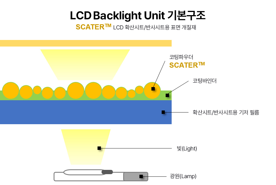 SCATER™ 는 투명성을 비롯한 광학특성 및 적합한 기계적 물성을 가지고 있는 특수 파우더로 LCD모듈의 확산시트 및 반사시트의 표면 코팅에 사용되고 있습니다. SCATER™ 는 내마모성이 우수하며 PMMA보다 부드러운 특성을 가지고 있어 확산시트 및 반사시트의 표면처리에 적합한 제품입니다.