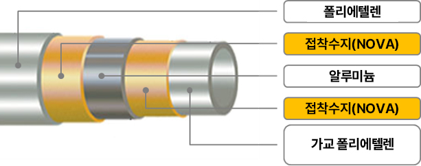 다층 알루미늄 복합 파이프는 냉온수, 각종 산/알칼리, 염수, 가스, 산소, 압축 공기 등 기체와 액체를 운반하는 용도로 널리 사용되고 있습니다. NOVA™ 접착 수지는 PE와 Aluminum 사이의 결합층 역할을 하며, 우수한 장기 접착 내구성을 제공합니다.