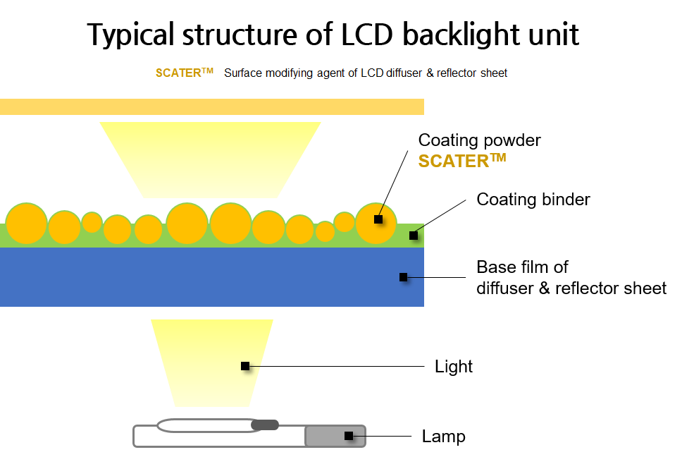 SCATER™ is used as a coating powder on the surface of diffuser sheet and reflector sheet in LCD Module due to its transparency and higher levels of luminance effect.